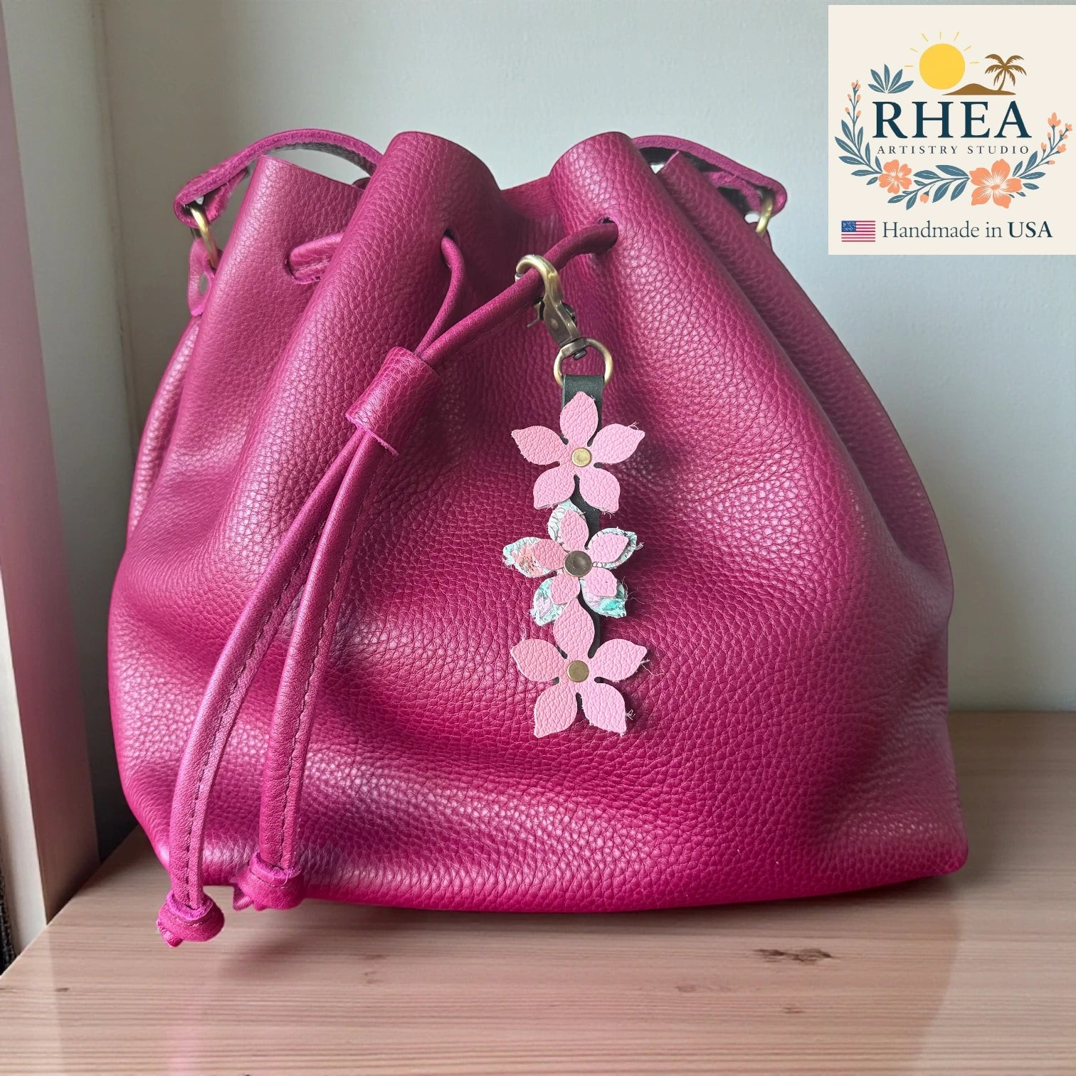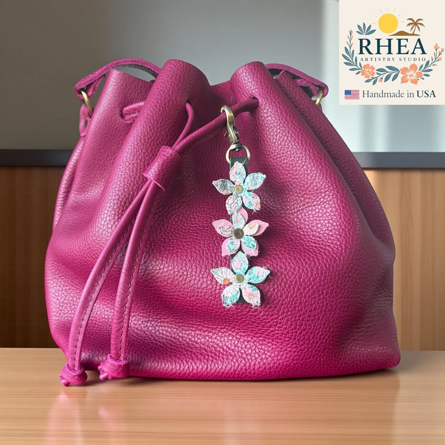 Handcrafted leather charm with brushed brass clasp. Stylish 5.5” accessory for bags or keys. Choose from floral and vibrant color options. 2oz, durable & chic.