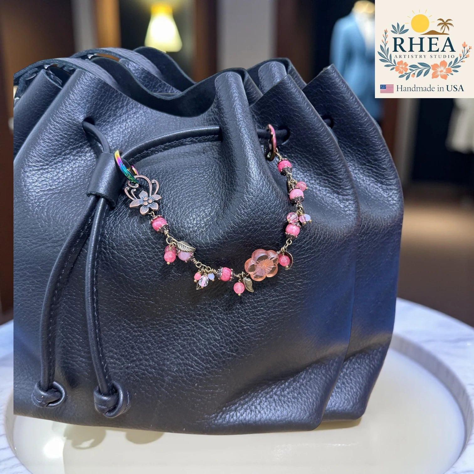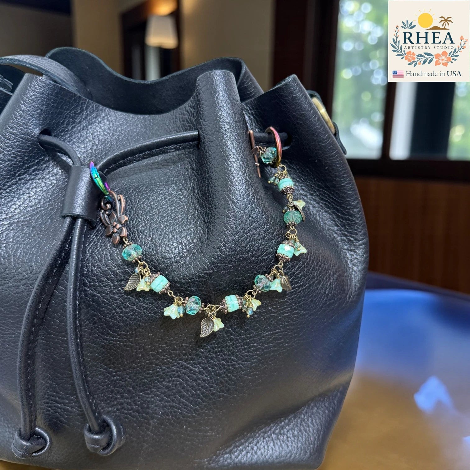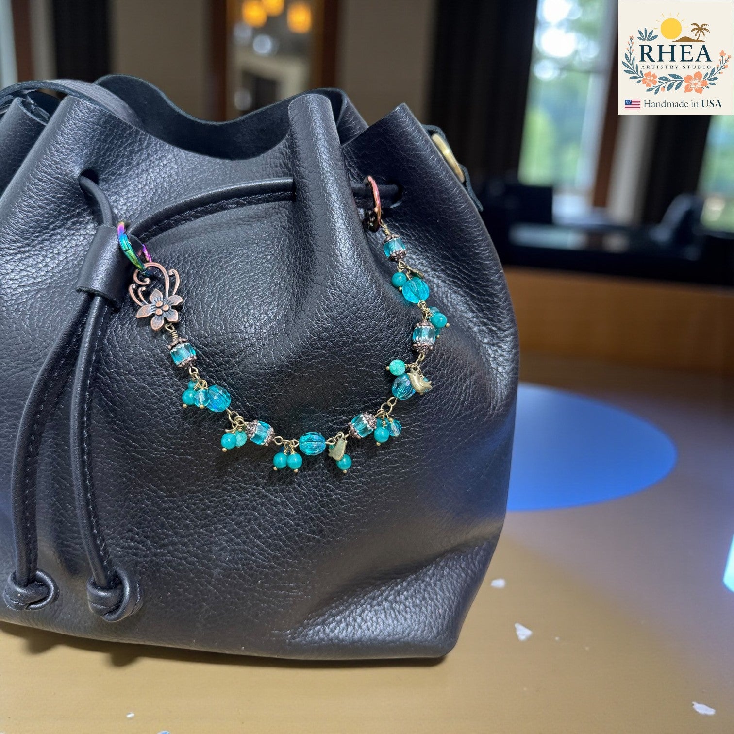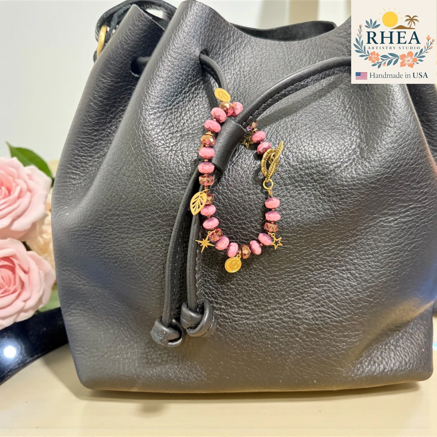 Designed with intention and made for versatility, these purse charms easily clip onto your favorite handbag, tote, or backpack using a sturdy brass toggle clasp for secure attachment which can be clipped on to any O-ring and D-ring. (Iridescent O-rings on the bag are 1 inch in diameter that are included )